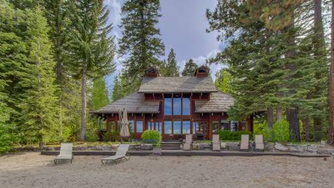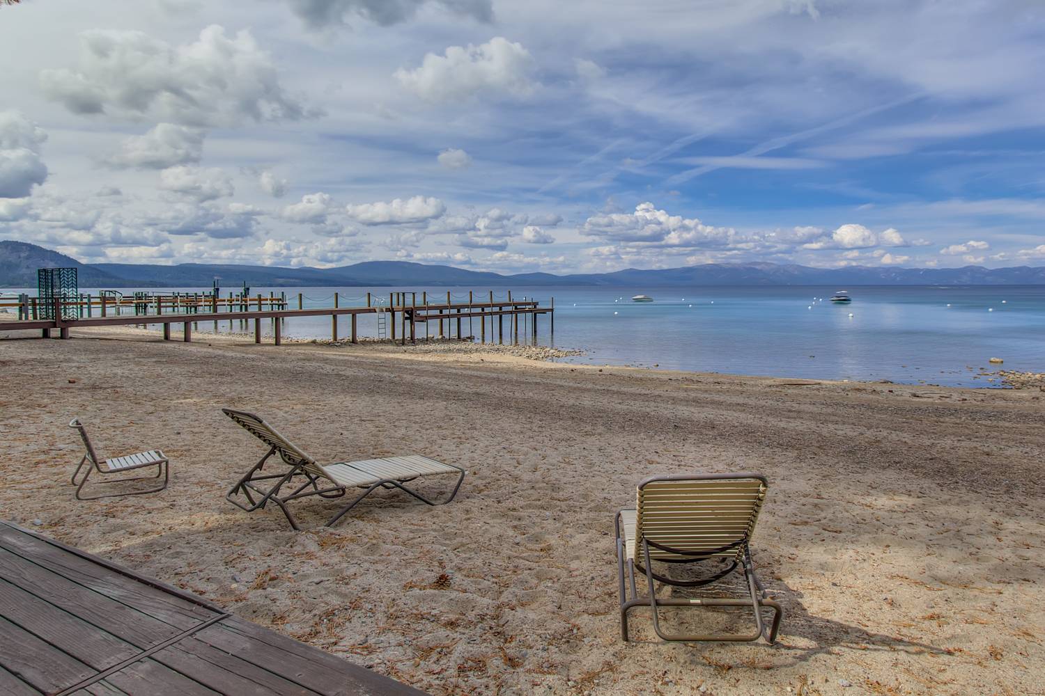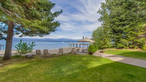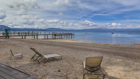 48 Moana Circle, pictured below, is a Homewood lakefront property on .83 acre with a pier, 2 buoys, sandy beach, and grassy lawn.