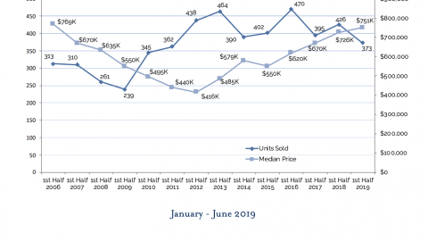 In the first half of 2019, we continue to see sales volume decrease and median price increase in all five micro-regions year over year. Interestingly, eight of the 11 lakefronts sold in Q2, picking up from only three lakefront sales in Q1 (all of which occurred in January). In Truckee and across the Tahoe Sierra MLS, 10% of homes sold over $2M. However, in Incline Village & Crystal Bay, 21% of single-family homes sold for over $2M in the first half of 2019. Not surprisingly, 82% of lakefront single-family homes sold over $2M. In both Truckee and Incline Village/Crystal Bay, median price reached a 14-year high. With a limited supply of inventory keeping sales volume low, we see an increase in demand driving increases in median price. With Q3 representing the bulk of summer sales, typically the peak of real estate season in Tahoe, we will look to Q3 to determine whether the first half of 2019 represents the year’s trend, or if the storyline changes with summer sales.