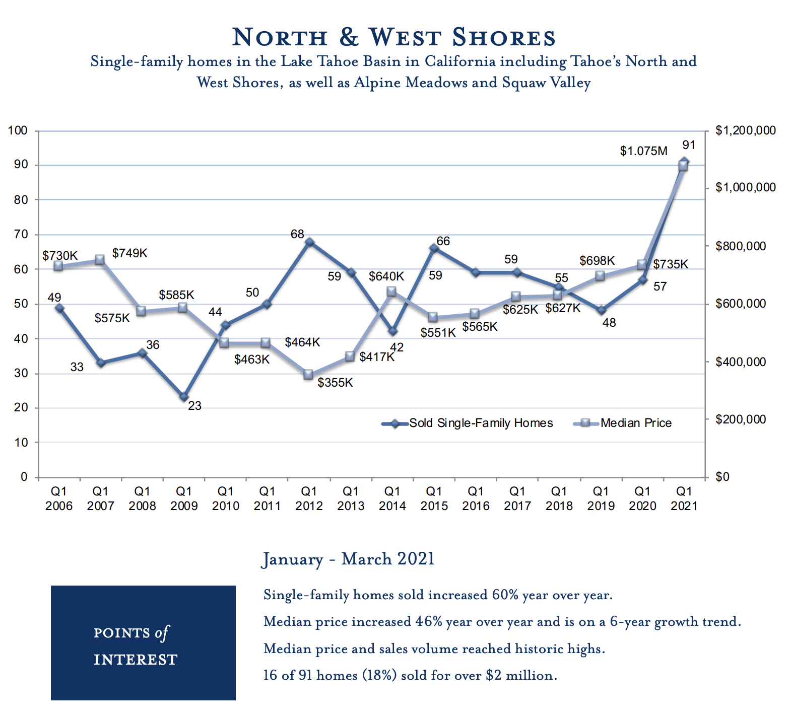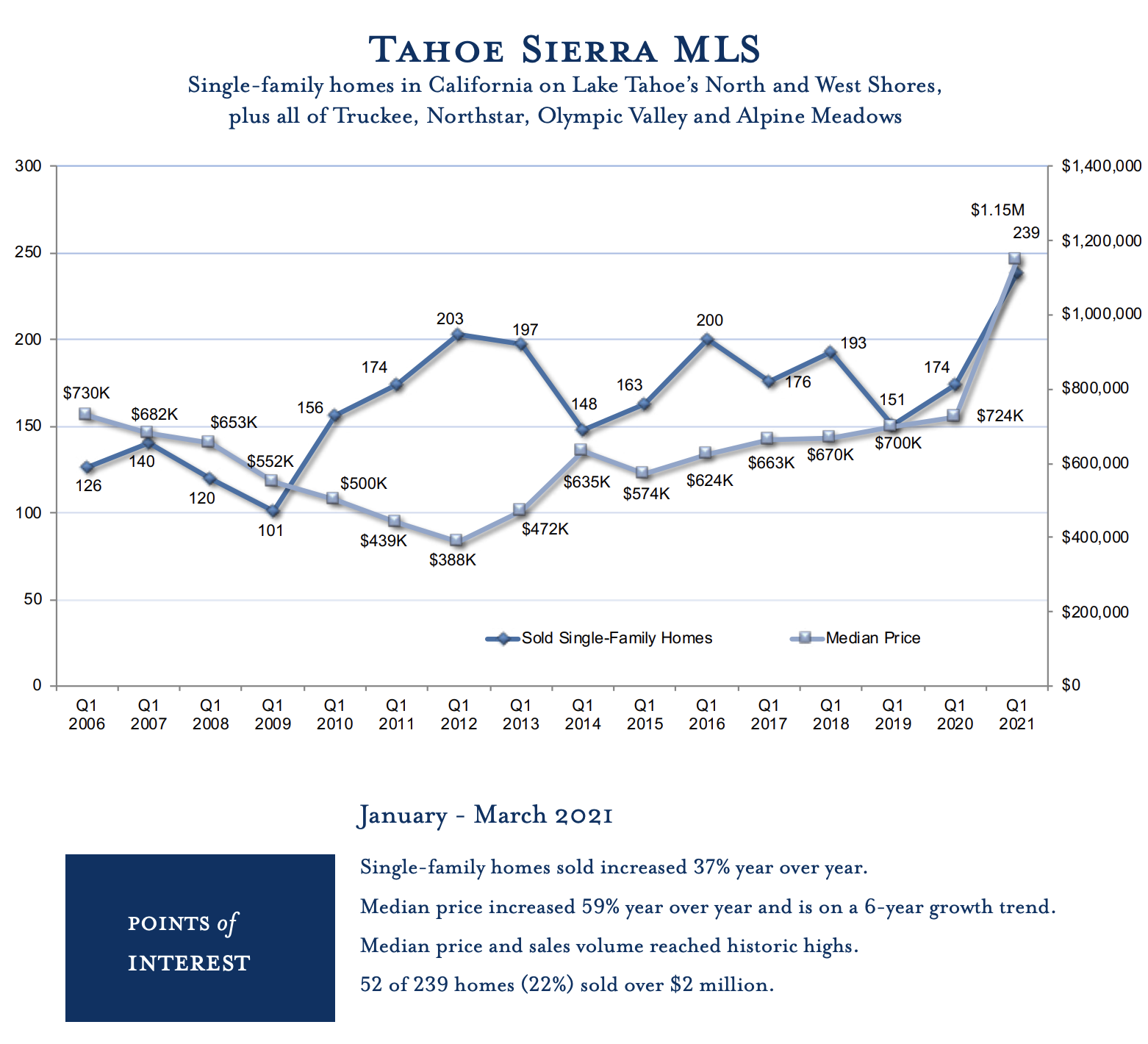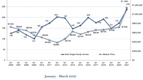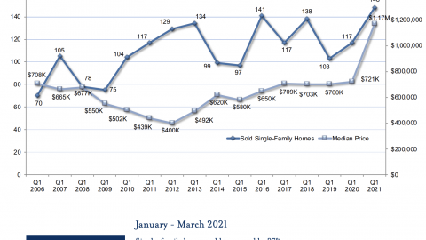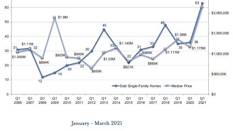 In the first quarter of 2021, we saw the continued impact of the pandemic on Tahoe’s real estate market. As we saw throughout 2020, the appeal of Lake Tahoe, as a convenient escape from urban centers, drove increased demand. The demand continued to exceed supply, triggering a flurry of buying activity that resulted in a spike in median price. All micro-regions, with the exception of lakefronts, saw unprecedented increases in both the number of homes sold and median price, reaching historic highs. The Tahoe Sierra MLS saw a 37% increase in sales volume of single-family homes year over year alongside a 59% increase in median price. Incline Village & Crystal Bay saw a 75% increase in sales volume alongside an 83% increase in median price year over year. For the first time in history, all micro-regions now show the median price of single-family homes over $1M. And, the percentage of homes that sold over $2M reached an all-time high. Seven single-family lakefront homes between Incline Village & Rubicon Bay sold in Q1, a high-mark that was matched in both 2006 and 2014. The median price of lakefronts decreased 33% year over year, however due to the small sample size, that decrease does not directly correlate to market depreciation, supported by the $31M lakefront sale in Q1 noted as the highest California-side lakefront sale in two years and the $31.5M lakefront sale in Incline Village. Given the current pace, it is foreseeable that the market remains strong through 2021, and as COVID threats subside and cities begin to reopen, we may see the state of the market level out in 2022.