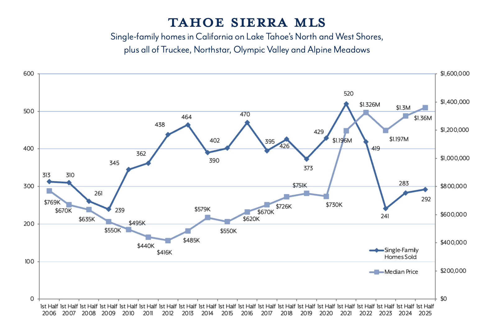 At the halfway mark of 2025, the Lake Tahoe real estate market reflects steady buyer selectiveness. Median prices have continued to rise in all the California regions, even as inventory increased. Across all regions, the number of homes actively listed for sale has increased by an average of 19% year over year. In June alone, the Tahoe Sierra MLS reported a 31% jump compared to June 2024—bringing inventory levels in line with pre-COVID benchmarks from 2019.