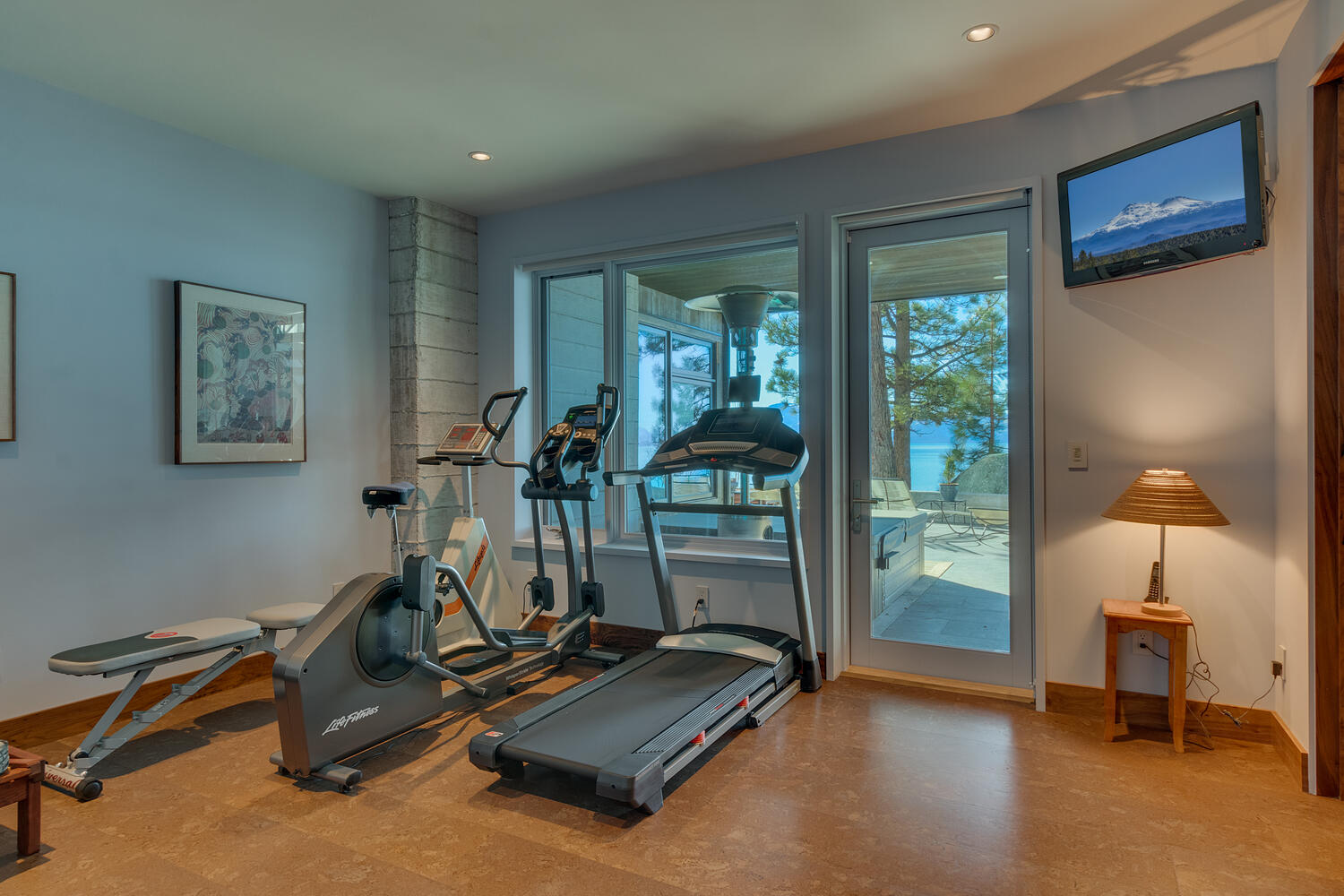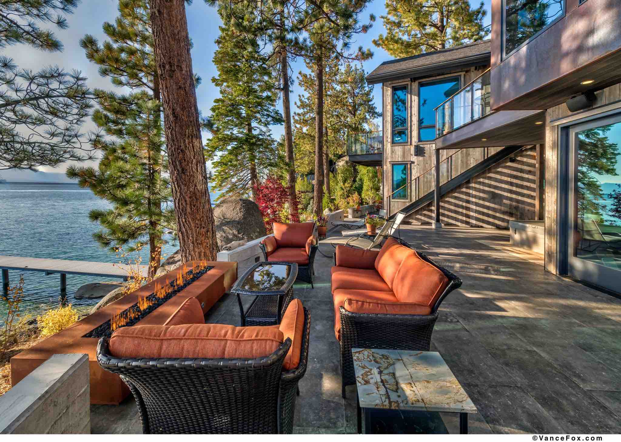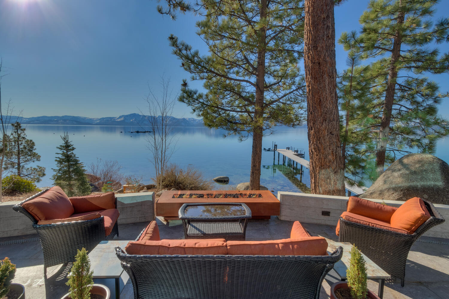 Step outside to the private sandy beach, or head out onto Lake Tahoe from the private pier with an adjustable lower landing, boat hoist and two buoys. Return home to enjoy the lush outdoor setting. Entertain on the patio with a complete kitchen (built-in barbecue, sink, fridge and storage), gather around the gas firepit, and soak in the hot tub under starry skies. Or, simply find serenity in the sitting areas of the garden.