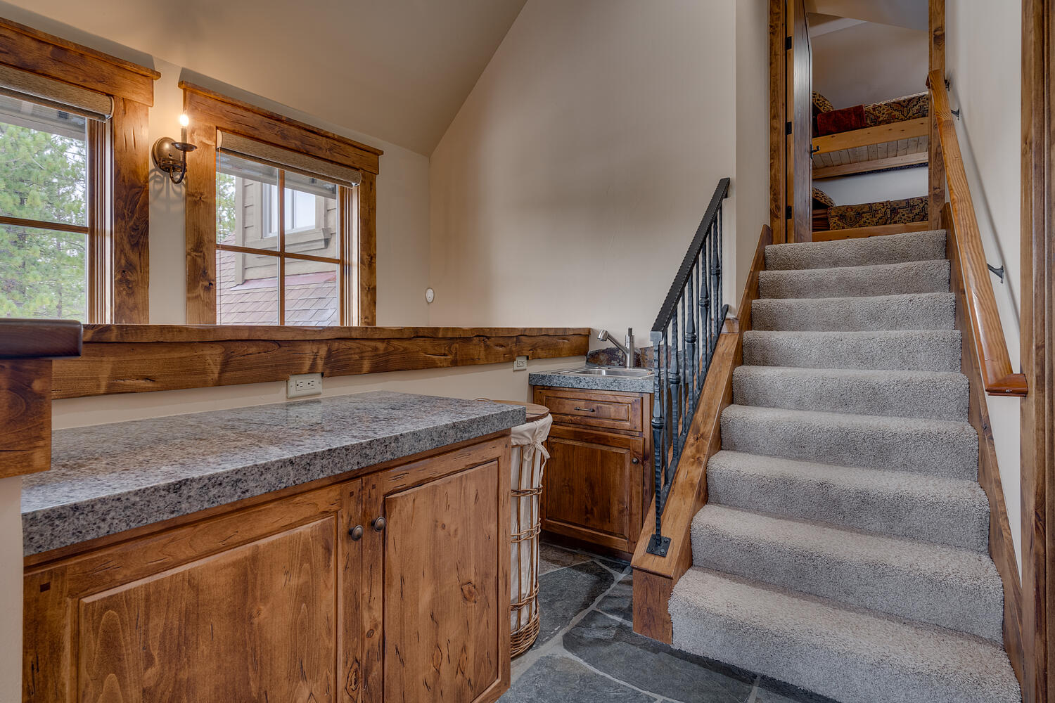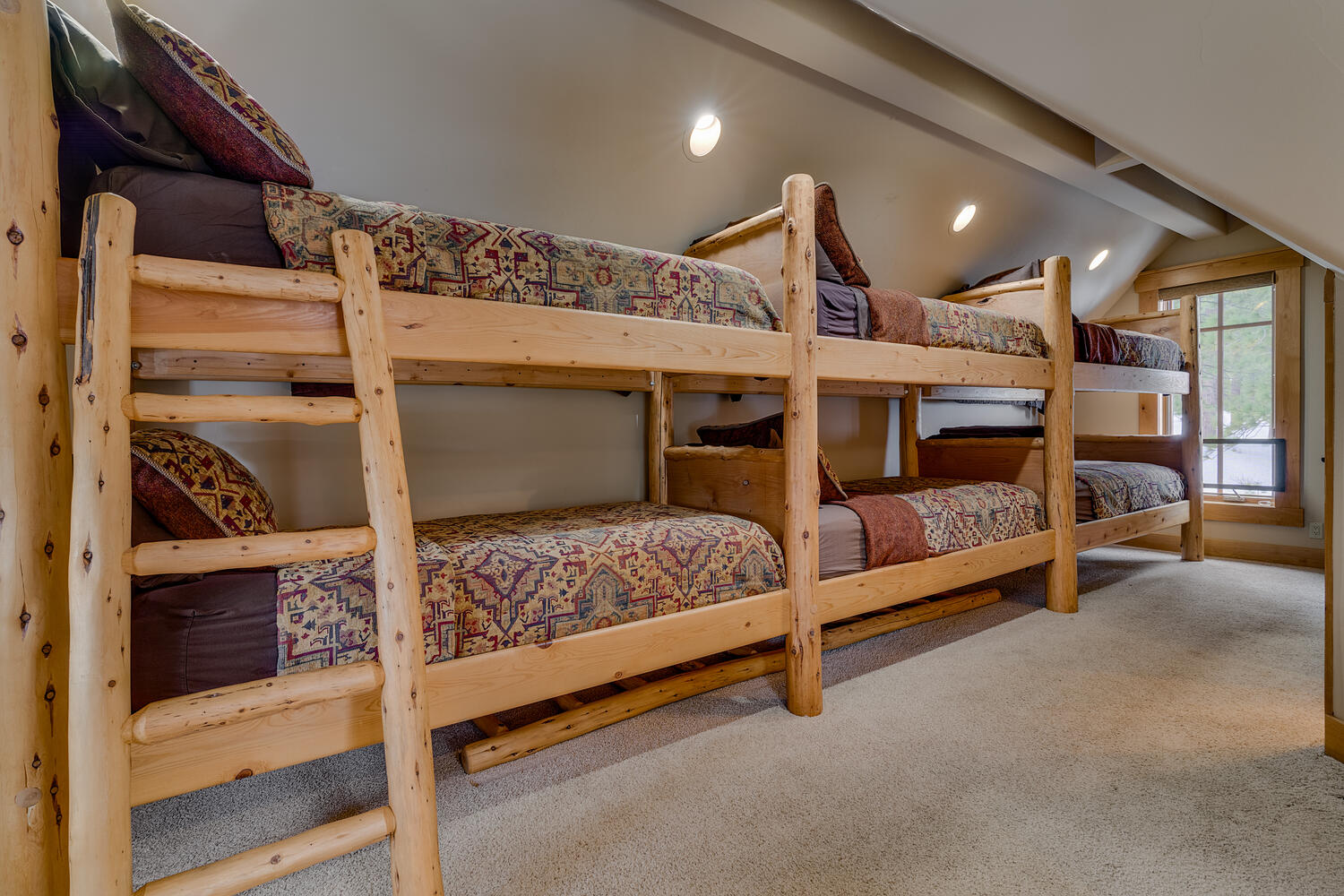 The home's architecture is a celebration of meticulous craftsmanship. Exquisite stonework, commanding beams, elegant slate accents, and intricate steel details converge to create an ambiance that is both majestic and inviting, reminiscent of a distinguished lodge. Spanning an impressive 4,140 square feet, the layout is thoughtfully designed to encompass four ensuite bedrooms, plus a kids' bunk room, ensuring privacy and comfort for all.