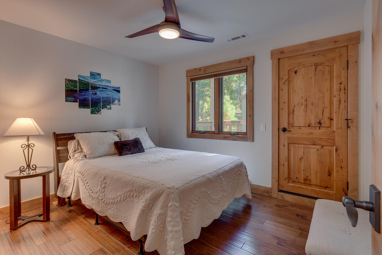 Inside, two fireplaces—one in the great room and another in the family room—set the scene for cozy Tahoe evenings. Designed for effortless entertaining, the open layout flows from the dining room to kitchen to the family room, where a wet bar invites guests to gather and savor the lake views inside or outside on the spacious deck. Upstairs, three comfortable bedrooms provide restful retreats, including one en suite and two that share a conveniently located bathroom. Central air conditioning and heat has recently been added to the house.